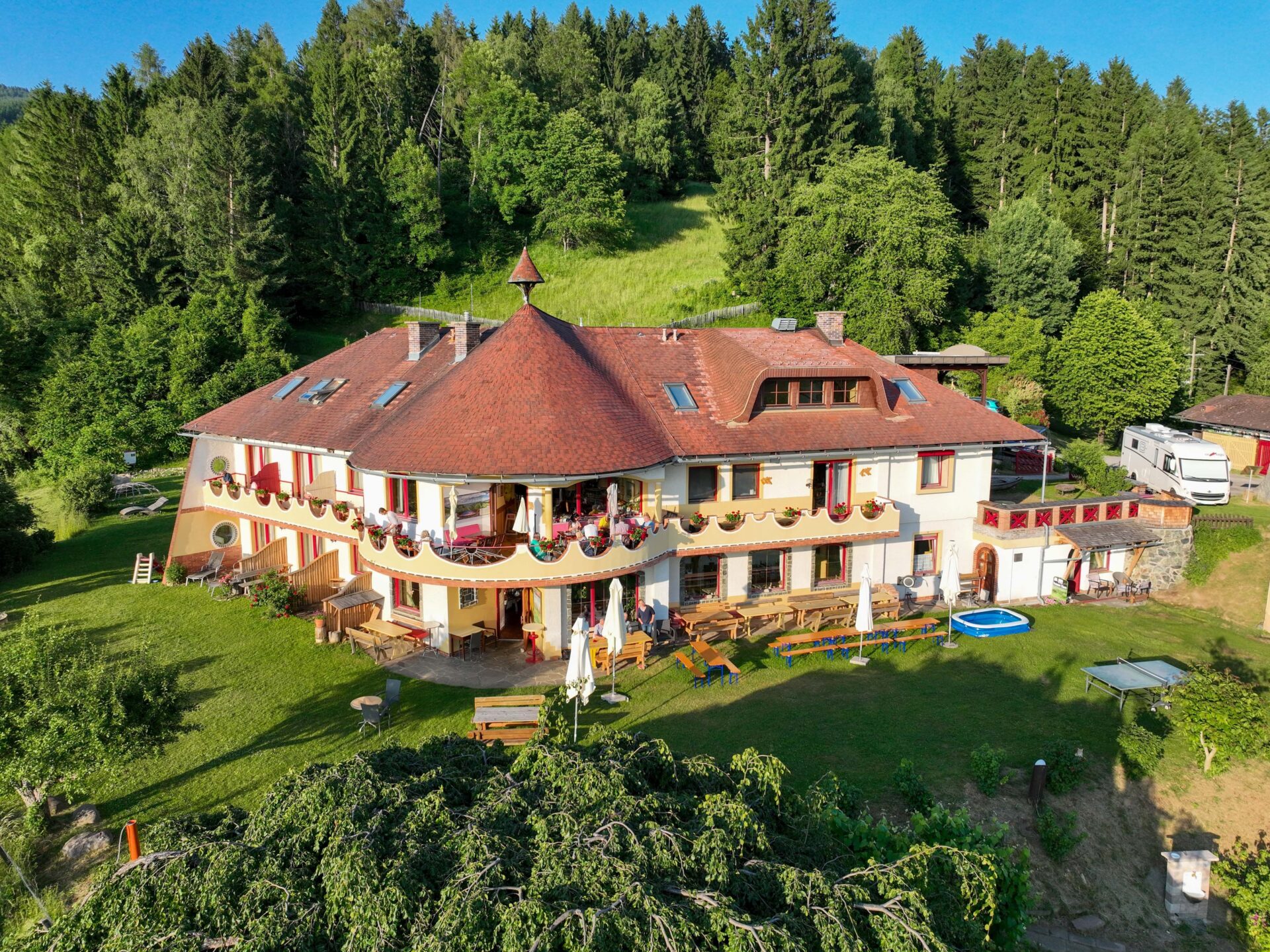 The hotel’s event program includes llama trekking and carriage rides, special experiences for children and seminars on health topics. The Saualpe is criss-crossed by a 100-kilometer network of well-marked hiking trails. Varied mountain bike tours are also possible in the surrounding area.